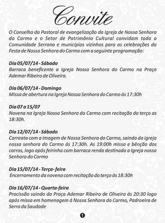 A Feirinha de Nossa Senhora do Carmo será dia 12 de julho de 2014, na praça Ademar Ribeiro de Oliveira, no centro da cidade.